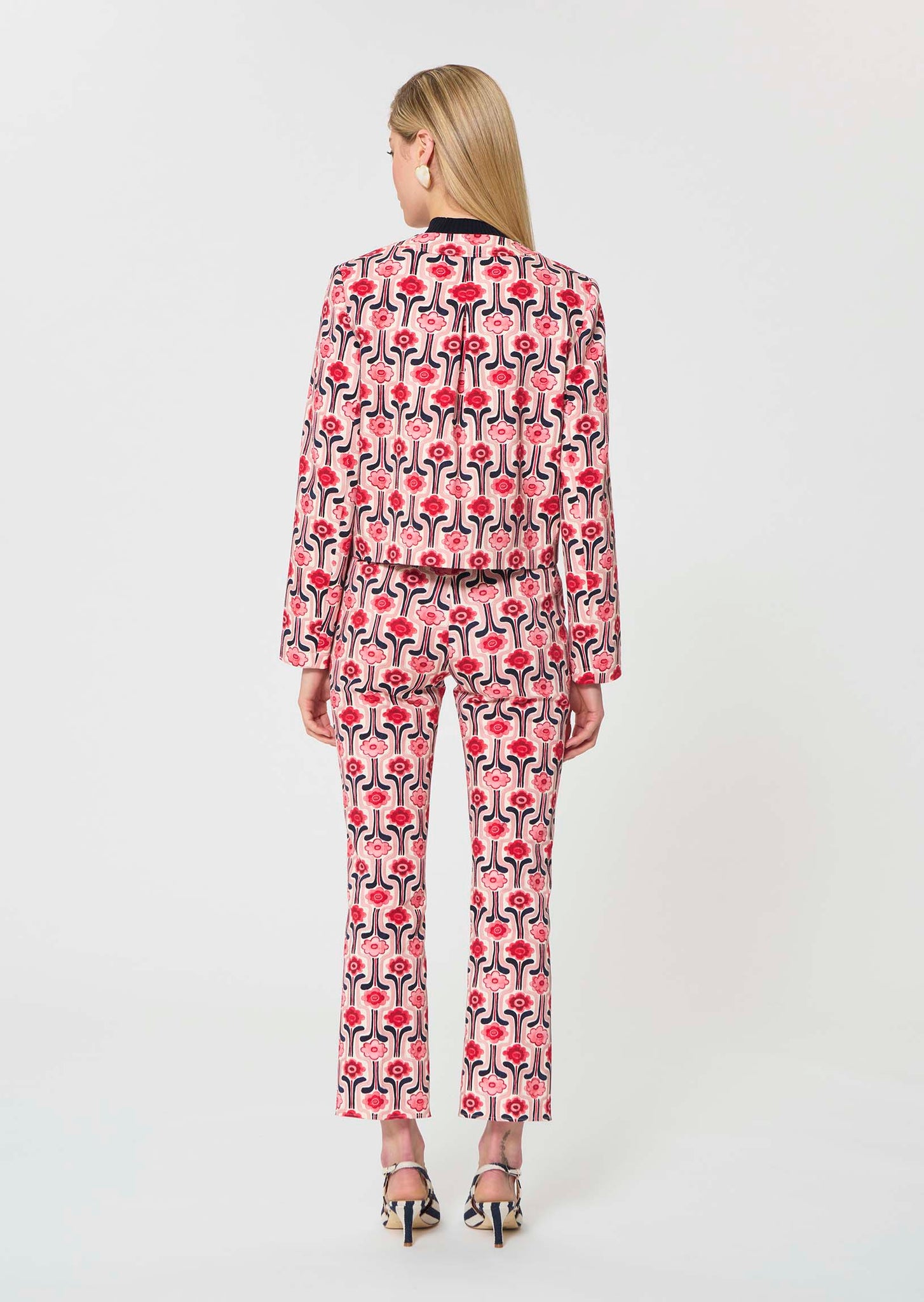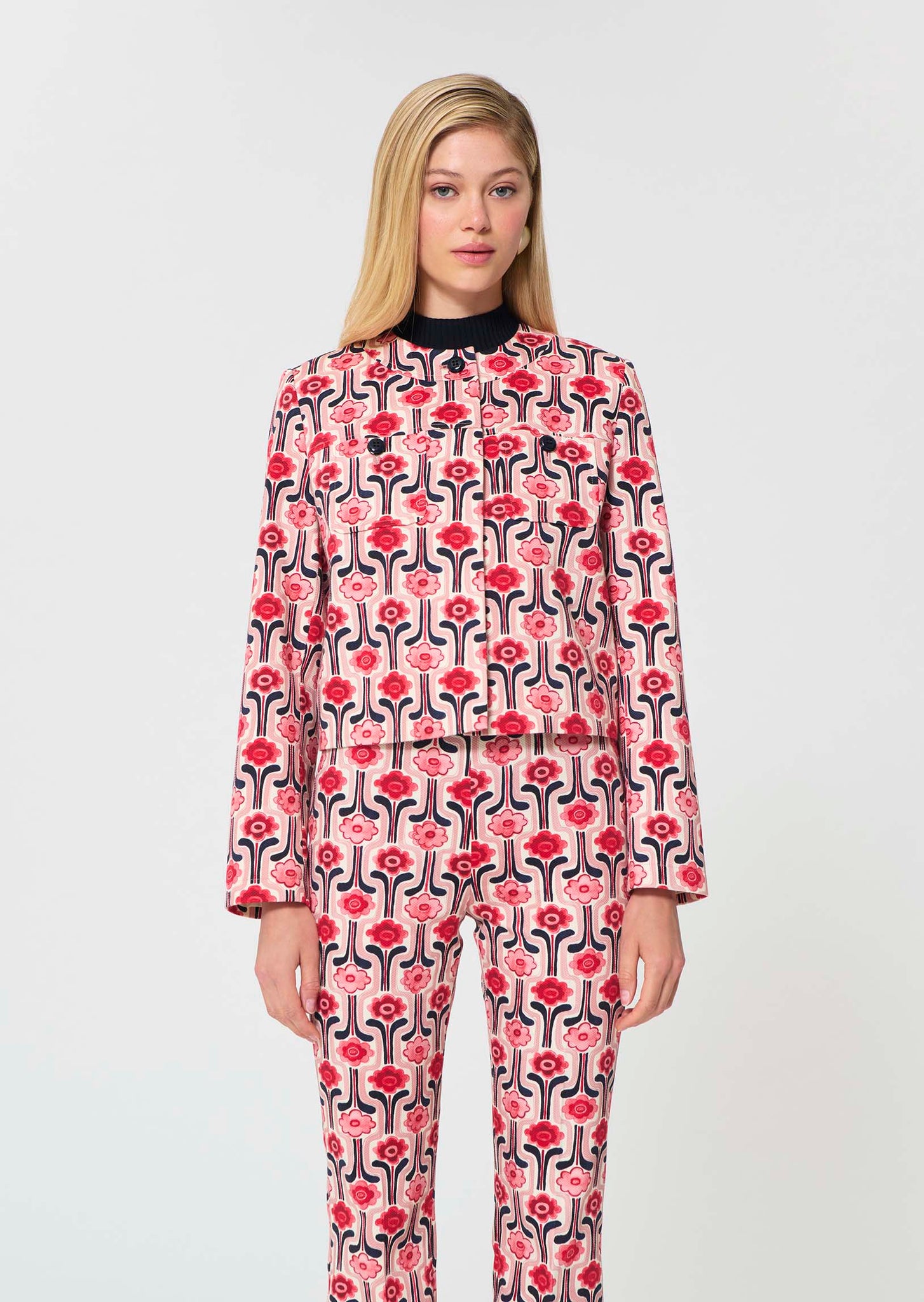 This short, blush pink tailored jacket is printed all over with our retro pattern and features long sleeves, shoulder pads, and a buttoned round neck. It has buttoned chest pockets. Wear it with the matching trousers for a complete retro look.98% COTTON 2% SPANDEX/ LINING: 65% POLYESTER 35% COTTON